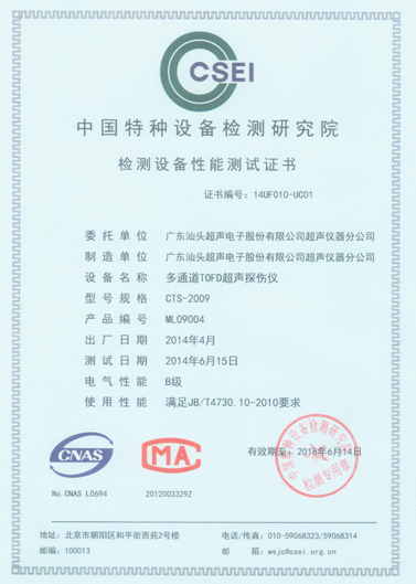中国特检院根据GB/T 27664.1-2011、EN 12668-1:2010、JB/T 4730.10-2010、JB/T 10061-1999 A、JB/T 9214-2010、JB/T 8428-2006、CSEI/QM-3-C114等多项标准要求对CTS-2009仪器的电气性能、功能和使用性能等进行系统测试,其中仪器的电气性能综合评价为B级(不带限定条件),达到国外同类先进仪器指标要求。在类似等效输入噪声、净增益等14个TOFD检测关键指标中达到A类性能指标要求。TOFD超声探伤仪CTS-2009是继第一代TOFD成像设备CTS-1008plus(2012年广东省高新技术产品)的后推出的新一代产品。